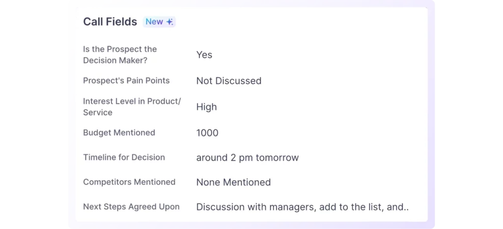 - Automatic Field Capture: Identify missed opportunities or inconsistencies in reps' conversations by automatically extracting key data points like designation, users, and next steps, directly from the conversation.